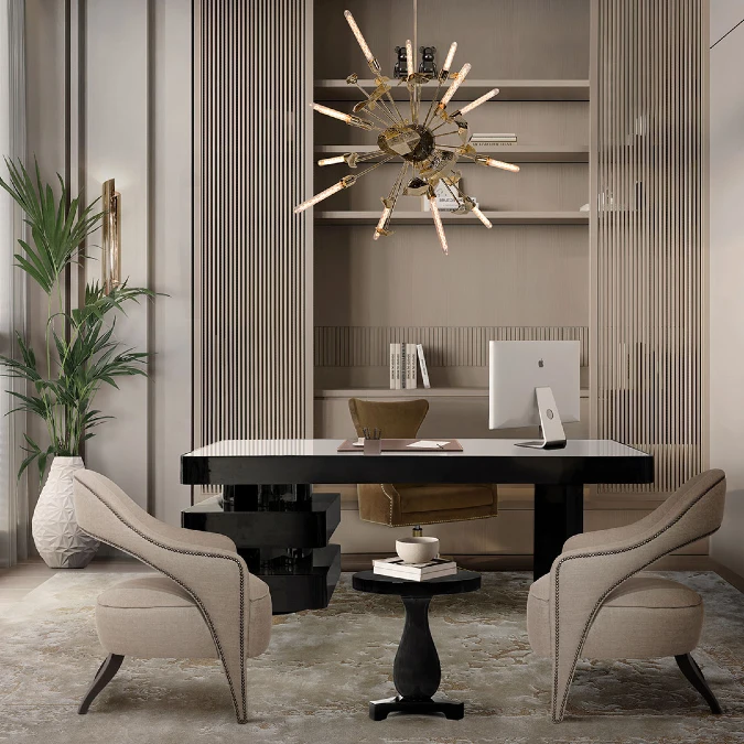 A large gold sputnik chandelier serves as the dramatic focal point of this elegant office. The multi-bulb fixture hangs above a sleek black and white desk with a sculptural base. Behind the workspace, built-in shelving features vertical slat details and soft integrated lighting.